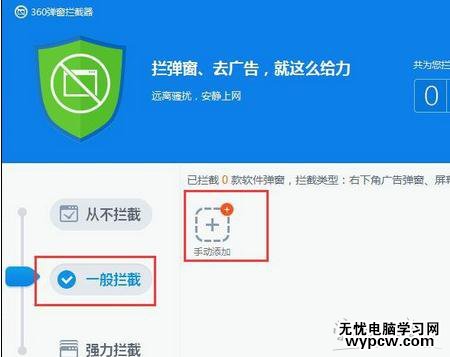 3、打開360彈窗攔截器后,切換到“一般攔截”,然后在右側點擊“手動添加”。如下圖所示