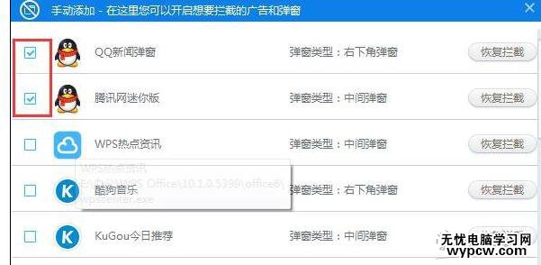 4、勾選要屏蔽的軟件如qq新聞彈窗和騰訊網迷你版兩個qq彈窗廣告,然后點擊“確認開啟”。如下圖所示