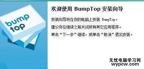 1、網(wǎng)絡(luò)下載bump top,下載完成后點(diǎn)擊下一步開始安裝,如圖所示: