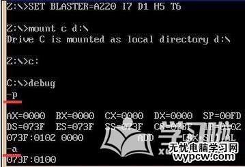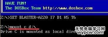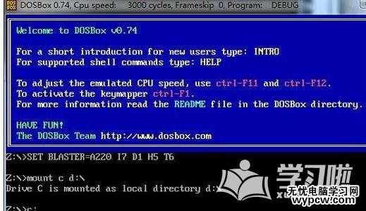 2、之后將下載下來的debug.exe放入磁盤根目錄,以d盤為例,在dosbox中輸入mount c d:/并按回車執行,如圖所示: