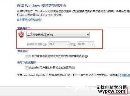 3、此時彈出windows update的更改設置窗口,我們將重要更新欄下的選項改為從不檢查更新并點擊確定保存設置,如圖所示: