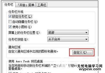 5、在調出的任務欄和開始菜單屬性窗口中,點擊通知區域欄下的自定義按鈕,如圖所示:
