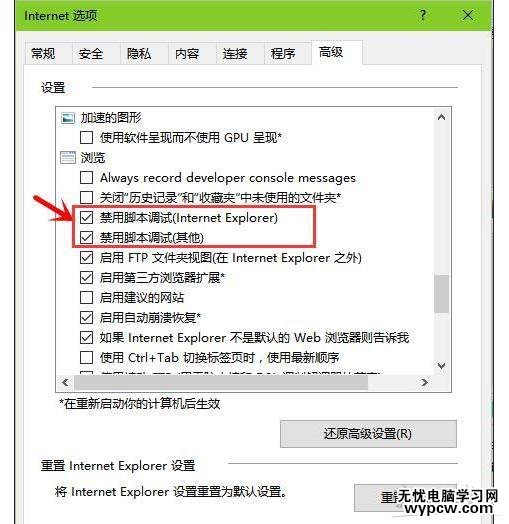 4、最后在internet選項窗口中,切換至高級選項卡,勾選其中的“禁用腳本調(diào)試”并點擊確定退出即可,如圖所示:
