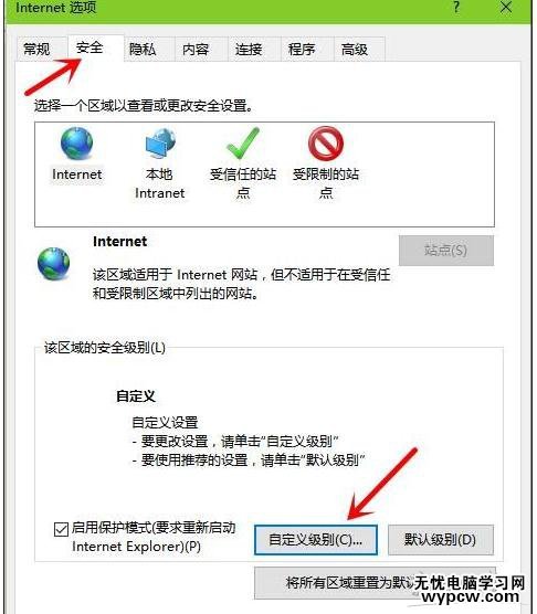 2、調(diào)出internet選項窗口后,切換至安全選項卡,并點擊下方的自定義級別按鈕,如圖所示: