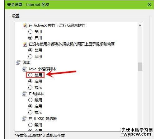 3、此時彈出安全設(shè)置-internet區(qū)域窗口,找到j(luò)ava小程序腳本點擊禁用并按確定保存設(shè)置,如圖所示: