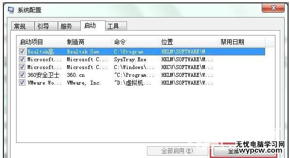 5、在系統配置窗口中,我們切換至啟動選項卡,點擊全部禁用將所有啟動項進行禁用操作,最后點擊確定保存設置,如圖所示:
