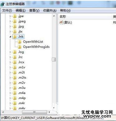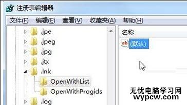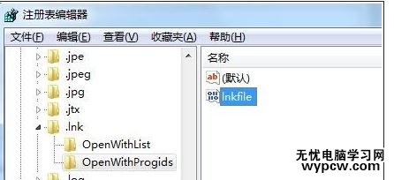 5、點擊“ openwithprogids ”,在右側(cè)僅保留“默認(rèn)”值和“lnkfile”值,其他多余的全刪除即可。