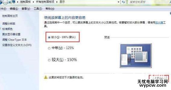 3、隨后點擊“較小(s)-100%(默認(rèn))”并選擇應(yīng)用生效,如圖所示: