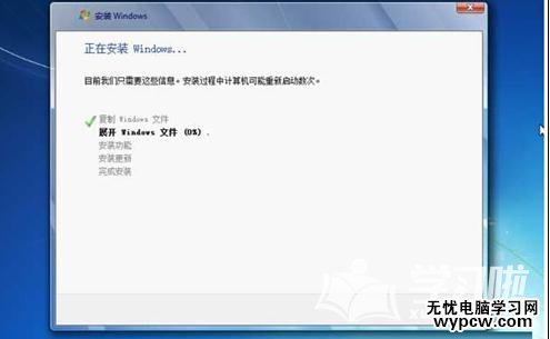 7、開始復制文件并進行安裝,接下來數(shù)次重啟,都是無需人工操作的,直到系統(tǒng)安裝完成。