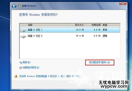 5、如果硬盤是新的沒有分區(qū)過則需要新建分區(qū),如果分區(qū)過了選中要安裝的分區(qū),然后點擊“驅(qū)動器高級選項”;