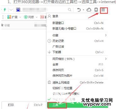 1、打開360瀏覽器->打開最右邊的工具欄->選擇工具->inte.net選項;