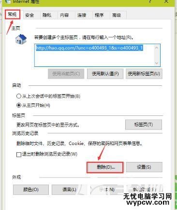 2、在彈出的internet屬性對話框中選擇常規->瀏覽歷史記錄->選擇刪除;