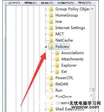 2、在注冊表左側依次展開:HKEY_CURRENT_USER/Software/Microsoft/Windows/CurrentVersion/Policies