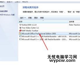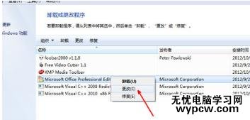 2.在要卸載或者更改的程序列表中,找到office軟件,如圖所示,如果你的軟件遭到了非常嚴重的破壞,連卸載更改程序都沒有的話,你就得需要用一些專業的卸載軟件來處理了。