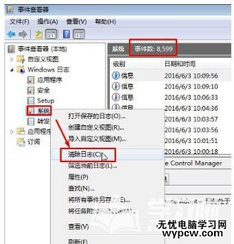 6、展開“windows 日志”,在“應用程序”上單擊右鍵,選擇“清除日志”;