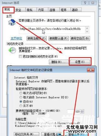 2、在“Internet 選項”界面“常規(guī)”選卡中點擊“瀏覽歷史記錄”下方的“設置”按鈕,在打開“Internet 臨時文件和歷史記錄設置”窗口總點擊“查看文件”;
