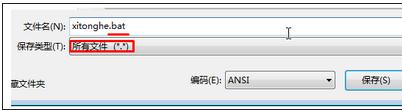 3、點擊左上角的“文件”—“另存為”,將“保存類型”修改為“所有文件”,將文件名修改為“xitonghe.bat”(這里重點就是后面的后綴,一定要是“.bat”才行)然后點擊保存;