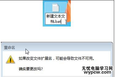 4、將“新建文本文檔.txt”單擊右鍵,選擇“重命名”,將后綴名“TXT”修改為“bat”按下回車鍵,在彈出的警告框中點擊“是”即可。