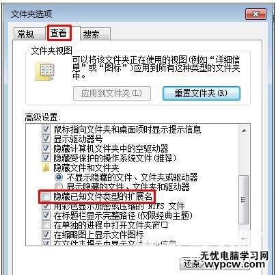 2、在文件夾選項中點擊“查看”選卡,在“高級設置”中確保“隱藏已知文件類的擴展名”未被勾選,點擊應用并確定;