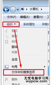 1、打開“計算機”,點擊“組織”—“文件夾和搜索選項”;