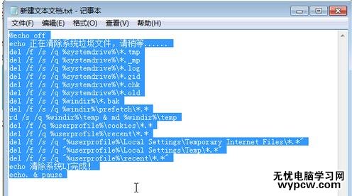 2、雙擊打開該文本文檔,將“bat”命令輸入進去:(這里以清理系統垃圾命令為例)