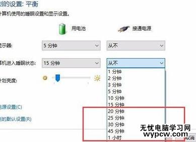 在該設(shè)置頁(yè)面中,點(diǎn)擊選擇不同模式下(接入電池或者是使用電源)的屏幕顯示時(shí)間設(shè)置,選擇調(diào)整顯示器工作的時(shí)間即可。