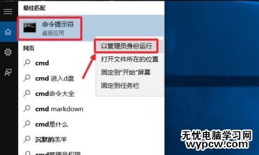 6然后搜索結果中,還是在命令提示符上單擊右鍵,選擇管理員身份運行。