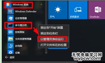 4所有應用中,我們在Windows系統中找到命令提示符,然后這時候在命令提示符上單擊鼠標右鍵,選擇以管理員身份打開命令提示符。