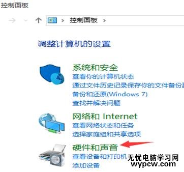打開控制面板以后,就會在控制面板中找到“硬件和聲音”,從下圖所示的箭頭指向中可以找到,然后點擊它。