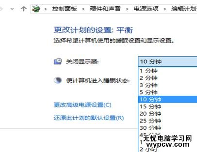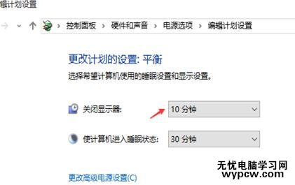 在下圖中,我們看到紅色箭頭指向的地方,默認10分鐘,如果電腦沒有任何操作,顯示器就會關閉了,那么我們來點擊一下后面的向下箭頭