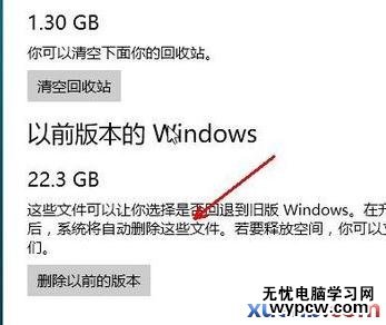 我們可以看到有一項(xiàng)就是以前版本的windows,注意系統(tǒng)的提示,如果你不打算恢復(fù)原來的系統(tǒng),就點(diǎn)擊“刪除以前的版本”