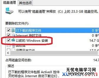 在新彈出的“C:的磁盤清理”對話框中,在“以前的windows安裝”前打勾
