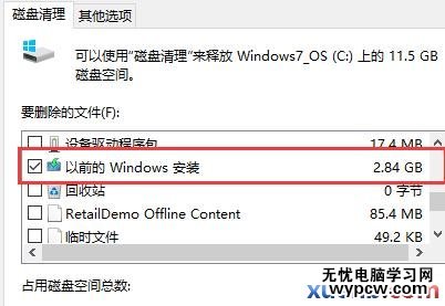 在打開的結果頁面中,找到要刪除的系統文件(名為:以前的Windows安裝),在其前面進行勾選,便可以看到該文件所占用C盤的具體大小容量了,不同電腦不同使用習慣,該文件所占用的空間也不盡相同,一般都是2G以上的大小,選中之后,直接點擊下方的確定按鈕,即可進行刪除釋放出C盤的空間了;如果你還沒考慮好是否放棄以前的系統,那么請慎重,否則,一旦刪除就只有重裝才回得去了
