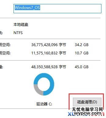 進入到C盤屬性查看頁面,在常規欄目下,可以看到磁盤清理選項按鈕,點擊打開