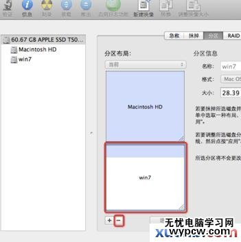 選擇“分區(qū)”選項卡,在分區(qū)布局:下面選擇需要刪除的“Win 7”分區(qū),然后點擊下面的“-”按鈕。