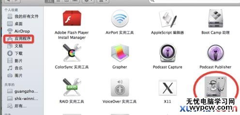 選擇Finder的側(cè)邊欄的“應(yīng)用程序”,打開“實用工具“后,雙擊打開“磁盤工具”。