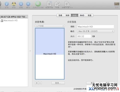點擊“應(yīng)用”后,“應(yīng)用”下面會提示“正在檢查文件系統(tǒng)”,等系統(tǒng)操作結(jié)束后,系統(tǒng)將恢復(fù)OS X單個磁盤分區(qū)。