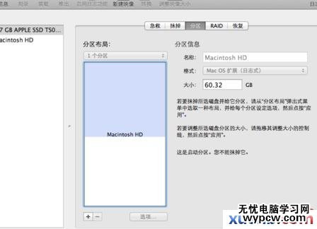 此時,只剩下mac OS X,選擇整個“Macintosh HD”,點擊“應(yīng)用”按鈕。以恢復(fù)此系統(tǒng)占用整個磁盤空間。