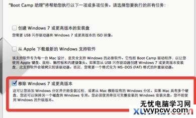 3在彈出“Boot camp助理”-選擇任務(wù)窗口,點選“移除Windows 7或更高版本”,然后,點擊“繼續(xù)”按鈕。