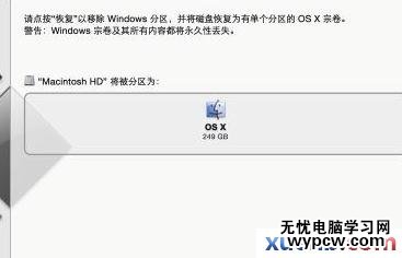 4在“將磁盤恢復(fù)為單一宗卷”窗口中,點擊右下角“恢復(fù)”按鈕。等操作結(jié)束,將移除Windows分區(qū),并將磁盤恢復(fù)為單個分區(qū)的OS X宗卷。
