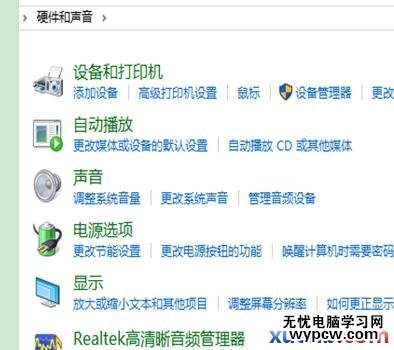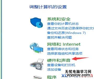 在打開的控制面板中,我們就會看到相關(guān)的功能列表,這里需要我們點擊“硬件和聲音”,下圖紅色箭頭的指向處