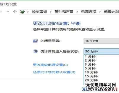 然后在新的界面中,就會看到“使計算機進入睡眠狀態(tài)”,后面有一個時間的列表,我們點擊這個列表