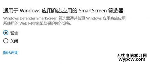 要禁用SmartScreen檢查Windows 應(yīng)用商店中下載的應(yīng)用,請在“Windows Defender SmartScreen 篩選器通過檢查 Windows 應(yīng)用商店應(yīng)用所使用的 Web 內(nèi)容來幫助保護你的設(shè)備。”中選擇關(guān)閉。