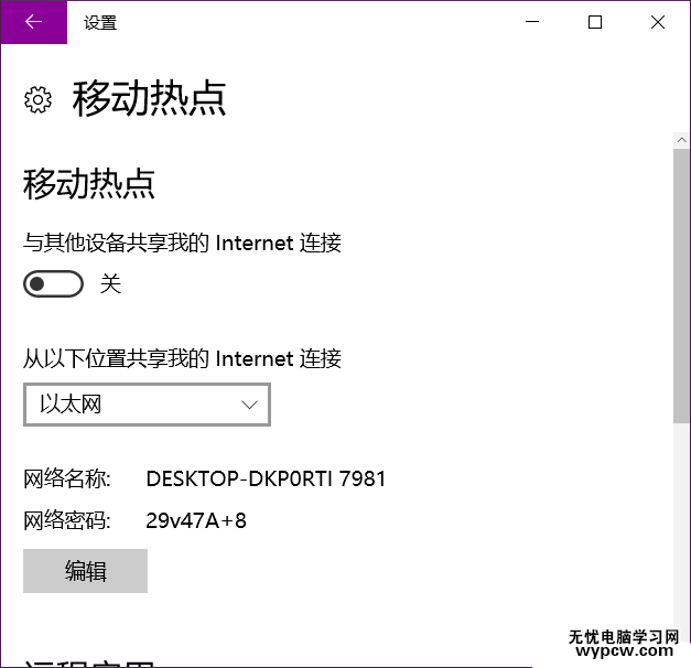 先點擊“編輯”修改熱點的網(wǎng)絡(luò)名稱和網(wǎng)絡(luò)密碼,修改完畢保存后,回到這個界面,點擊“與其他設(shè)備共享我的Internet連接”下的滑動開關(guān)至“開”。