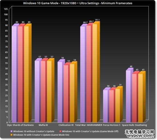 紫條:未進行創意者更新的Win 10,紅條:更新后(游戲模式關閉),黃條:更新后開啟游戲模式
