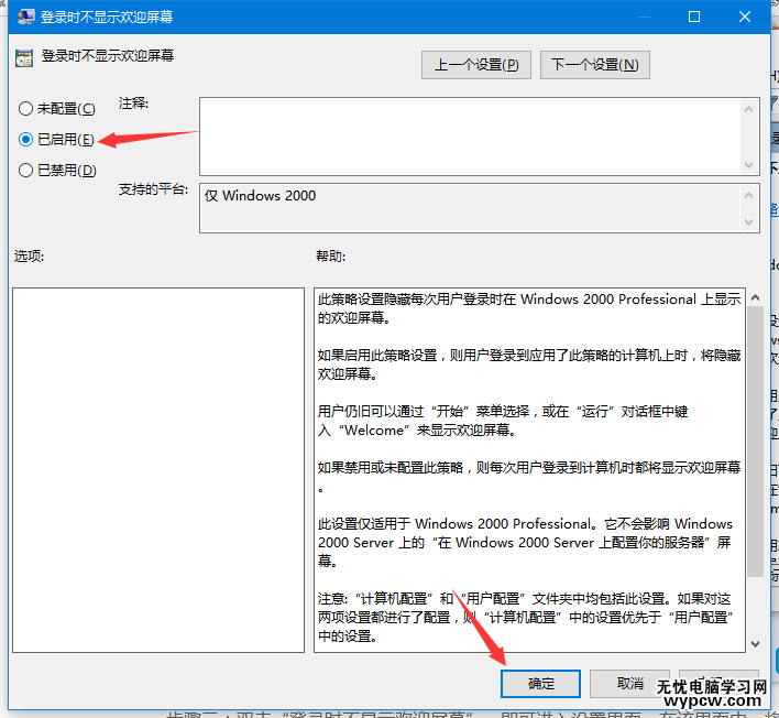 3、雙擊打開“登陸時不顯示歡迎界面”,勾選“已啟用”,然后點擊“確定”保存退出即可,再次開機時就不會顯示開機界面,而是直接進入桌面了。