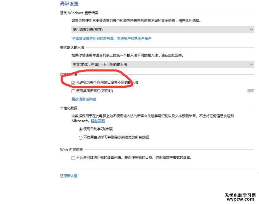 4、將“允許我為每個(gè)應(yīng)用窗口設(shè)置不同的輸入法”選項(xiàng)打上✔