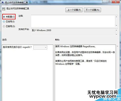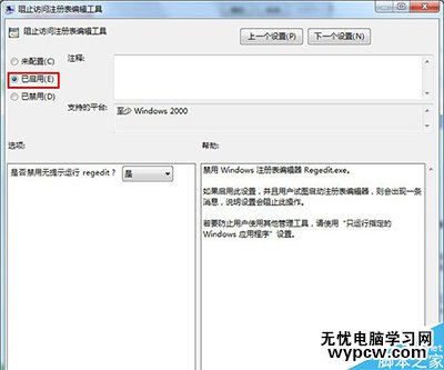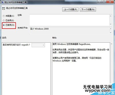 7、如果我們要使用注冊表時,可以在阻止訪問注冊表編輯工具窗口中,把已啟用更改為:已禁用,然后點擊:確定,就可以解除鎖定注冊表編輯器;