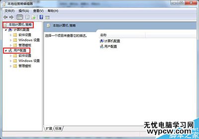 2、我們在本地組策略編輯器窗口的本地計算機 策略下找到用戶配置,并點用戶配置前面的小三角展開;