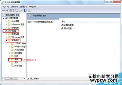3、我們在用戶配置的展開項中找到:管理模板,在管理模板下找到:系統,并左鍵單擊:系統;